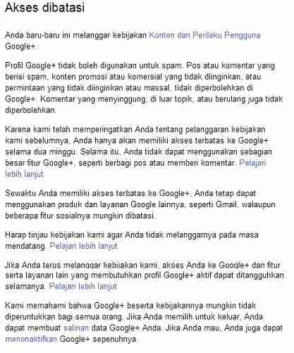 Setelah meninjau profil Anda, kami memutuskan bahwa konten (misalnya teks, gambar, atau nama) melanggar Kebijakan Konten dan Perilaku Pengguna atau Kebijakan Nama Google+. Harap perhatikan bahwa profil hanya tersedia untuk perorangan; untuk bisnis dan entitas lain, gunakan laman Google+.Selama ditangguhkan, Anda tidak dapta menggunakan layanan Google secara utuh yang membutuhkan profil aktif, seperti Google+, Pustaka, dan Picasa. Hal ini tidak akan menghalangi Anda untuk menggunakan layanan Google lainnya, seperti Gmail.