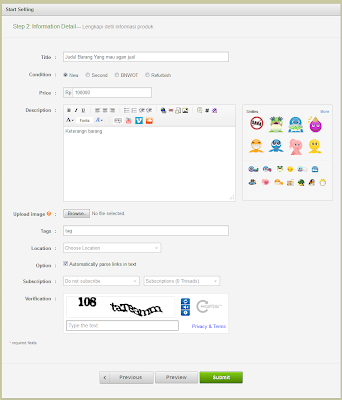 Di halaman selanjutnya anda diminta untuk mengisi form detail barang meliputi nama barang, kondisi barang, harga, deskripsi barang, gambar, dan lain-lain. Terakhir anda harus mengetikkan kode verifikasi berupa captcha. Setelah semua terisi dengan benar lanjutkan dengan mengklik tombol submit. Atau anda juga bisa kembali mengedit kategori barang dengan tombol previous dan bisa juga melihat hasil sementara dengan tombol preview.
