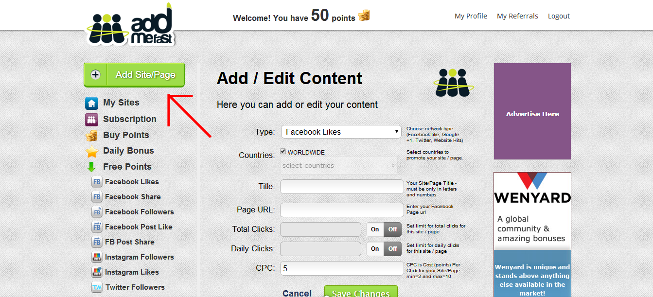 4.Jika anda sudah register, silahkan klik pada Add Site / Page