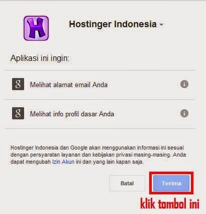 Setelah Anda melakukan klik pada salah satu tombol tersebut, maka akan muncul popup persetujuan aplikasi, klik saja Terima dan setelah Anda menerima persetujuan tersebut, maka Anda akan menerima konfirmasi pada halaman dashboard idhostinger Anda bahwa akun google milik Anda sudah terhubung, jika Anda masih belum memiliki akun gmail, silahkan baca update sebelumnya mengenai Cara Membuat Email Baru di Google. Langkah selanjutnya adalah klik pilihan Buat Website! yang terdapat di pojok kanan atas tepat dibawah logo website idhostinger, maka akan muncul kotak dialog pembuatan website dan klik Hosting Account.