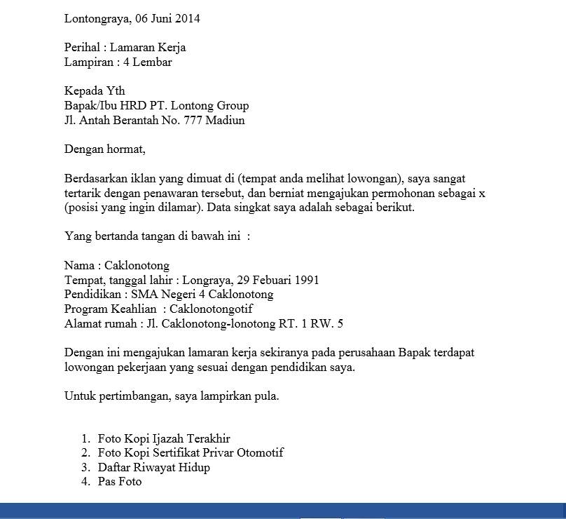 Sebenarnya contoh surat lamaran kerja ini kami buat bertujuan agar memudahkan anda sebagaimana fungsinya, sangat mudah di buat dan di pahami, tapi memang sebagian dari kita telah lupa struktur serta format surat yang benar dalam pembuatan surat lamaran pekerjaan ini. Disini kami akan berikan contoh surat tersebut berdasarkan pengalaman penulis.
