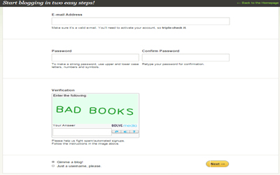 - Isi form pendaftaran pada kolom alamat email aktif Anda, isi kolom password, masukkan kode verifikasi dan beri tanda pada "Gimme a blog!". Jika sudah diisi dengan lengkap silakan tekan klik tombol "next".