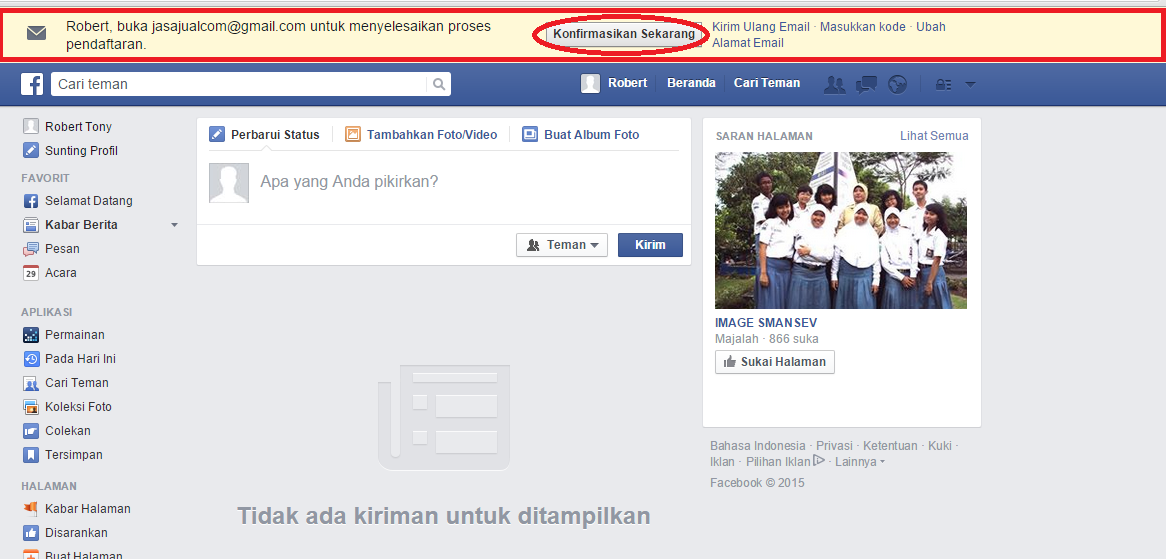 4. Maka akun facebook anda sudah jadi, akan tetapi masih ada beberapa hal yang masih harus diselesaikan lagi, yaitu verifikasi email supaya facebook dapat mengkonfirmasi bahwa pengguna akun ini adalah diri anda sendiri, serta agar lebih aman dalam menggunakan fitur yang ada di facebook. Untuk melakukan verifikasi sangatlah mudah, yaitu dengan cara klik pada notifikasi bagian atas facebook berupa garis warna kuning dengan tulisan Konfirmasi Sekarang