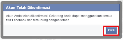 6. Jika anda sudah melakukan konfrimasi melalui email, maka anda akan diberikan notifikasi oleh facebook seperti gambar berikut ini, klik pada Oke untuk menyelesaikan tahap pembuatan