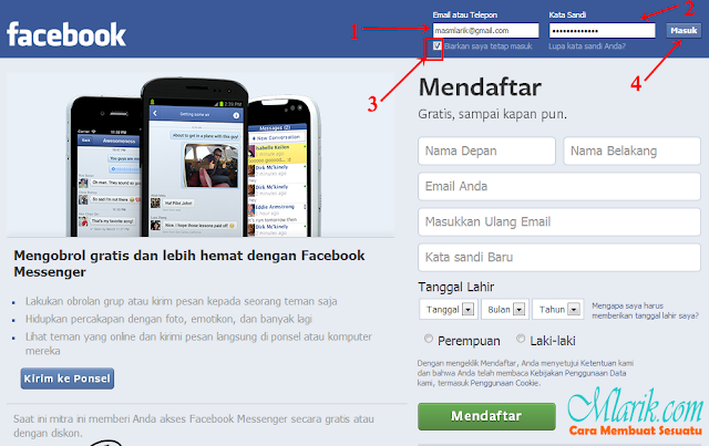 2. Silakan masukkan alamat email Anda pada kotak yang diberi tanda no 1 dan password pada kotak yang diberi tanda no 2. Jika Anda ingin selalu masuk dalam artian Anda tidak akan logout/keluar dari facebook di komputer Anda silakan centang kotak kecil yang diberi tanda no 3. Langkah terakhir silakan klik Masuk yang diberi tanda no 4. Untuk lebih jelasnya silakan Anda lihat gambar di bawah ini.
