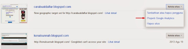 Klik https://www.google.com/webmasters/tools/homeKlik KELOLA SITUS di bagian kanan nama blog Anda lalu klik Properti Google Analytics
