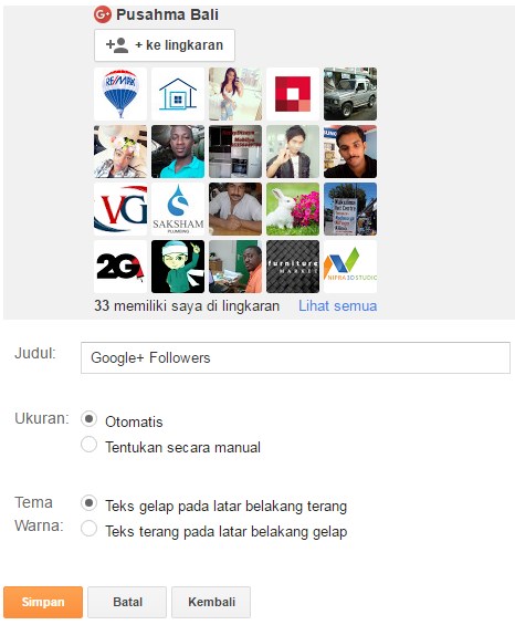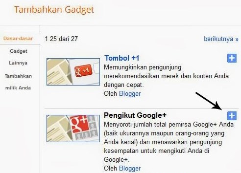 7. Setelah itu klik tanda + pada menu widget Pengikut Google+ seperti yang ditunjuk tanda panah pada gambar di atas.