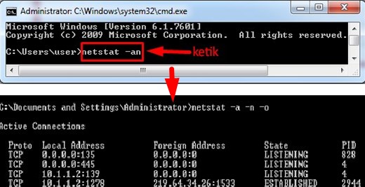 - Selanjutnya pada jendela command prompt, ketik "netstat -an" kemudian tekan tombol ENTER.