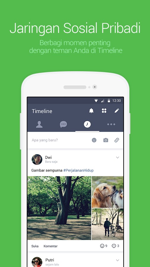 Dengan fitur Timeline, kamu bisa mengupdate kegiatanmu dengan menggunakan teks, foto, video, sticker atau bahkan info lokasi. Jangan ketinggalan juga mengikuti posting teman-temanmu!