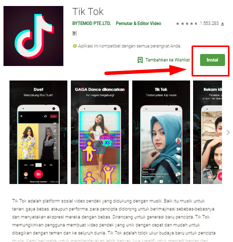 - Dan setelah itu instal/pasang aplikasi Tik Tok.