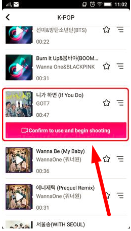 - Setelah kamu memilih genre musik yang kamu ingin gunakan maka secara otomatis akan muncul semua daftar lagu dari genre musik tersebut. Silahkan pilih lagu yang ingin kamu gunakan lalu sentuh confirm to use and begin shooting.