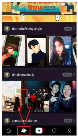 - Silahkan buka aplikasi Tik Tok yang ada pada smartphone kamu. Dan langsung sentuh ikon Planet seperti gambar di bawah ini.- Kini kamu bisa lihat semua hasil rekaman video dari pengguna aplikasi Tik Tok lainnya.