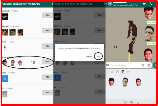 KESEPULUH. Kalian hanya tinggal pilih tombol (Add). Foto-foto selfie kalian akan dimpor kedalam Whatsapp sebagai set stiker baru yang dapat digunakan dalam percakapan kalian..