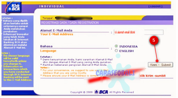 - Selanjutnya silahkan masukan alamat email anda yang aktif, ini digunakan untuk menerima kode aktivasi keyBCA setelah itu klik tombol Kirim - Submit, selesai.