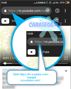- Cari video yang ingin kamu download. Setelah itu pada bagian url ganti dari https://m.youtube.com/...menjadi ssyoutube.com/...