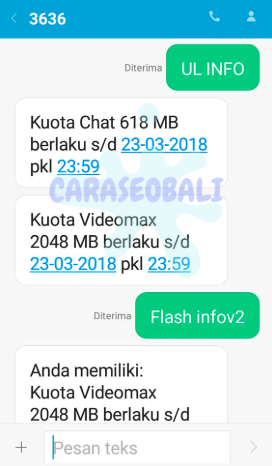 Jika format diatas tidak mendapat balasan, kamu bisa memakai format Flash(spasi)infov2 kirim ke 3636. Untuk lebih jelasnya silahkan lihat gambar di bawah ini.