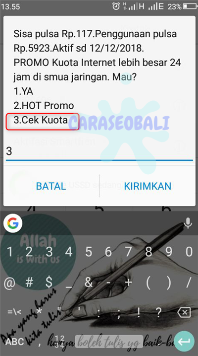 Muncul popup lagi, silahkan pilih nomor 3.Cek Kuota.