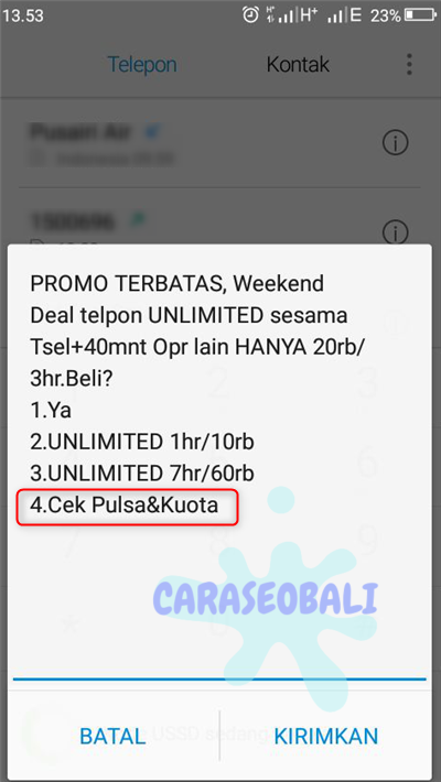 Maka akan muncul popup, silahkan pilih nomor 4.Cek Pulsa&Kuota.