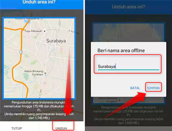 4. Silahkan pilih area atau lokasi pada Google Maps yang ingin kamu unduh, setelah itu pilih dan sentuh UNDUH yang ada di kanan bawah layar dan selanjutnya beri nama lokasi yang sudah kamu pilih untuk bisa digunakan secara offline. Langkah terakhir pilih dan sentuh SIMPAN.