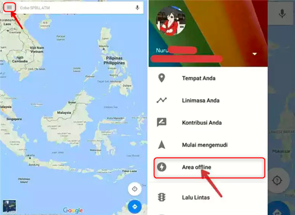 2. Sentuh menu yang ada dibagian pojok kiri atas, kemudian pilih dan sentuh Area Offline.