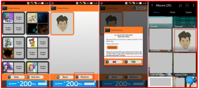 Tetapi, kalau kalian memakai aplikasi ini, kalian harus sedikit berusaha mencari foto yang akan kalian pulihkan, sebab gak cuma foto yang kita hapus yang ditampilkan, tetapi juga ikon aplikasi yang pernah kita instal sebelumnya di perangkat.