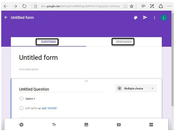 Beralih dari tab Pertanyaan ke tab Responses di editor formulir Anda untuk melihat tanggapan saat ini terhadap formulir Anda dan tautkan ke spreadsheet.
