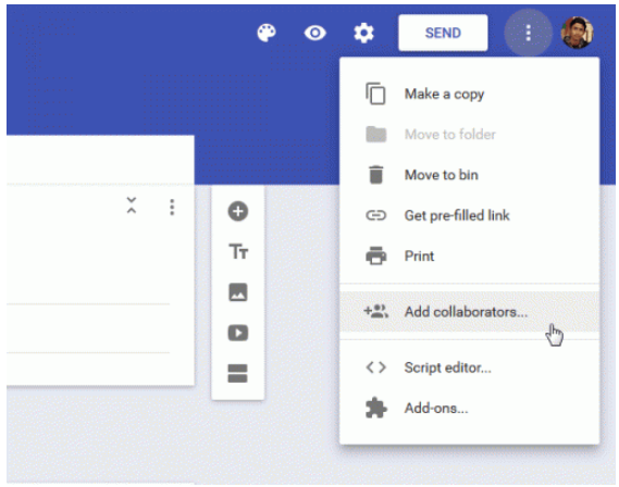 Di menu kanan atas Anda dapat mengubah skema warna form, melihat pratinjau formulir, gunakan tombol Send untuk berbagi formulir, dan akses opsi tambahan lainnya, termasuk menginstal add-on untuk Forms.