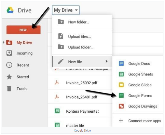 - Dari drive.google.com, klik New > Lainnya. Di samping Google Forms, arahkan ke Panah kanan dan klik Blank form or From a template.