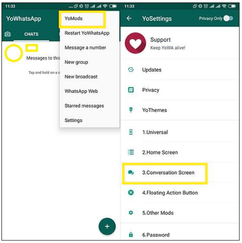 2. Selanjutnya jika sudah selesai menginstall YoWhatsApp, kemudian yang temen-temen lakukan adalah regristrasi memakai nomor Whatsapp temen-temen . Kalau temen-temen sudah selesai, maka temen-temen masuk ke aplikasinya langsung saja masuk tap ikon opsi 3 titik yang berada di sudut kanan atas. Jika sudah selesai maka temen-temen pilih YoMods > Conversation Screen.