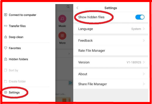 * Setelah mengklik menu setting kemudian anda centang menu show hidden files agar file yang tersembunyi di ponsel mu dapat ditampilkan.