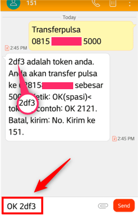 Pertama, buka aplikasi perpesanan di HP kamu. Lalu buat pesan baru dengan format Transferpulsa(spasi)nomor penerima pulsa(spasi)nominal pulsa. Jika sudah langsung kirim ke nomor 151.Kedua, tunggu hingga kamu mendapatkan balasan pesan konfirmasi yang berisikan Kode Token transaksi transfer pulsa im3 kamu. Balas pesan dengan format OK(spasi)kode token yang tertera di awal pesan. Maka pulsa kamu akan ditrasnfer!