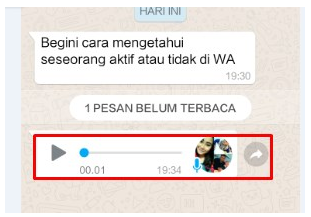2. Selanjutnya sebaiknya kalian coba untuk mengirimkan pesan suara kepada orang tersebut, dan contohnya kalian bisa lihat seperti gambar dibawah ini. Kemudian bagaimana cara mengetahui apakah chat yang kalian kirim telah dibaca atau belum?, caranya sangat gampang jika pesan suara kalian sudah di dengar atau diunduh, maka itu berarti WhatsApp orang tersebut sedang online.
