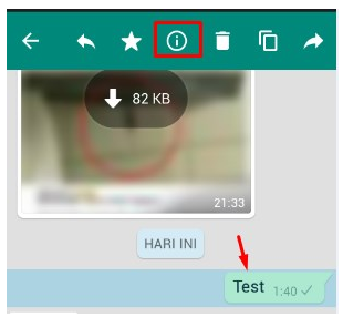 Selanjutnya cara lain jika ingin mengetahui apakah pesan WhatsApp telah dibaca atau belum, silahkan kirim chat di WA grup yang dia ikuti. lalu tap tulisan yang dikirim contoh “test” selanjutnya klik huru “i” kalian bisa lihat gambar contoh pada kotak merah dibawah. Kemudian setelah itu akan muncul pemberitahuan siapa saja anggota grup yang sedang online.