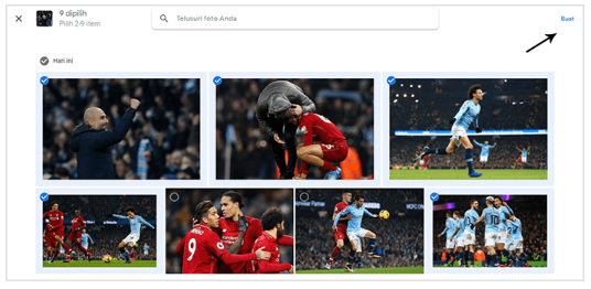 4. Maka dengan segera Google Photos akan menampilkan deretan foto yang kalian miliki. Dan silakan kalian pilih foto mana saja yang ingin kalian jadikan kolase → buat. Disini kalian bisa membuat kolase foto minimal 2 foto dan maksimal hingga 9 foto.