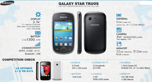 Sama halnya dengan LG, samsung yang merupakan salah satu produk dari korea yang sudah mendunia ini juga pernah merilis android dengan ukuran yang mini. Jika dibandingkan dengan LG L20, samsung galaxy star trios memiliki ukuran 0,14 inci lebih besar. Performa smartphone ini juga tidak kalah dengan LG L20. Tahun perilisan-nya juga sama yaitu pada tahun 2014, hanya saja berbeda bulan. Jika LG L20 rilis pada agustus 2014, sedangkan Samsung galaxy star trios pada Mei 2014. Tiga bulan lebih awal.Sony Ericsson Xperia Active (3 inci, 480 x 320 piksel)