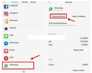 2. Selanjutnya, kalian dapat klik opsi tersebut dan cari aplikasi WhatsApp. Jika ketemu, maka tap aplikasi tersebut dan disini kalian lanjutkan dengan menekan tombol ‘Paksa Berhenti’.