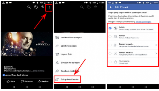 2. Selanjutnya pada bagian foto, kalian cari foto mana saja yang ingin kalian sembunyikan dari akun, jika sudah masuk ke foto tersebut, langsung kalian klik ikon tiga titik pada bagian pojok kanan atas dan pilih opsi ‘Edit Privasi Berita’.