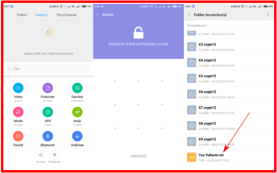 Buka lagi file manager disana anda lakukan tarikan kebawah hingga muncul ikon gembok. Tarik sampai ikon gembok tersebut dipenuhi lingkaran warna oranye. kemudian masukkan pin atau pola. Selanjutnya anda akan masuk ke folder tersembunyi.