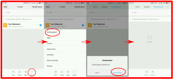 Tap pada file manager. Kemudian pilih salah satu folder tempat anda menyimpan foto dan video. Selanjutnya kalian pilih file yang akan anda sembunyikan tekan file tersebut hingga muncul opsi dibawah nya. kemudian Klik sembunyikan. Tunggu hingga file tersebut menghilang.Sekarang pasti anda bingung bagaimana caranya untuk melihat file yang barusan anda sembunyikan. Tenang begini caranya.