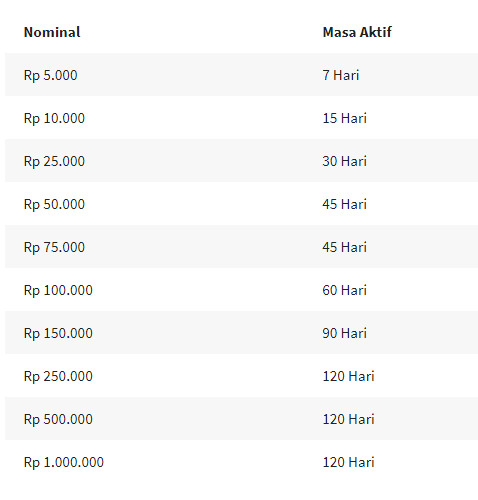 Masa aktif yang diperoleh tergantung jumlah pulsa yang dikirim, berikut detailnya: